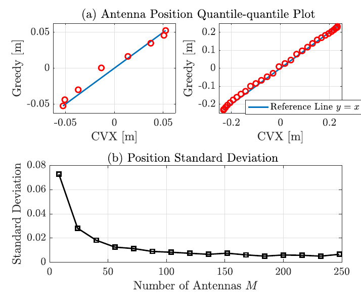 由于\(s\)是角度域的变量,天线最优位置问题至此就转化为角度域上的加权Fekete点问题。由于外场函数形式特殊,闭式解较难求解,因此会议版中我们选择使用贪婪算法求解。该算法模拟的是Leja序列的生成过程,通过逐步选择最优点来构建天线位置集合。该算法的伪代码如下,不过本文中增加了一个简单的位置约束,防止天线过于集中。
