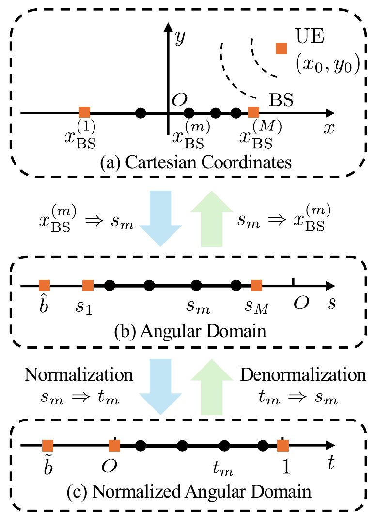 上述转化过程如图所示,我们先将天线位置变换到角度域\(s_m\),然后进行归一化。通过求解归一化的电荷平衡问题,并对结果进行合适的反变换,我们就可以得到天线的最优位置。
